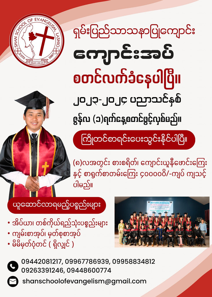 Shan School of Evangelism Lashio is a missionary school under the Church On The Rock Lashio, which produces many missionaries every year. In addition to missionary studies, it is also a school that teaches music, literature, diversity and technology.